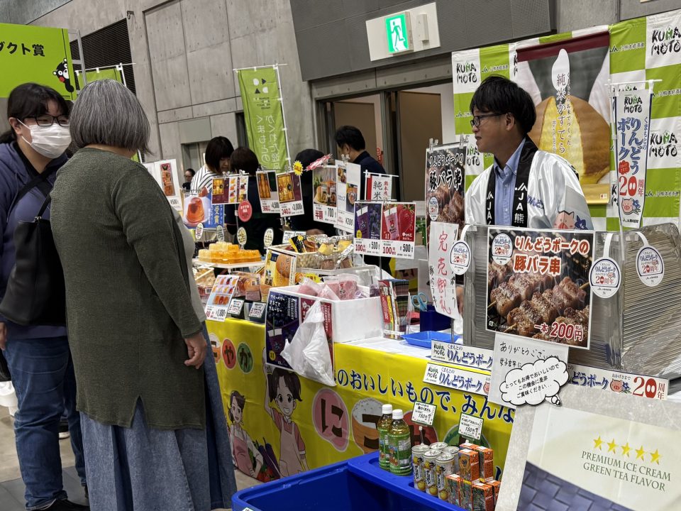 同経済連畜産部が「くまもとのりんどうポークの豚バラ串」を販売したほか、you+youくまもと農畜産物市場は新鮮な県産青果物、ユーユーフーズ(株)は純米かすてらや熊本彩果ゼリーなどの加工品を販売しました。安全・安心で新鮮な県産農畜産物を求める来場者が多数訪れ、午前中に完売する商品も出るなど盛況のうちに終了しました。