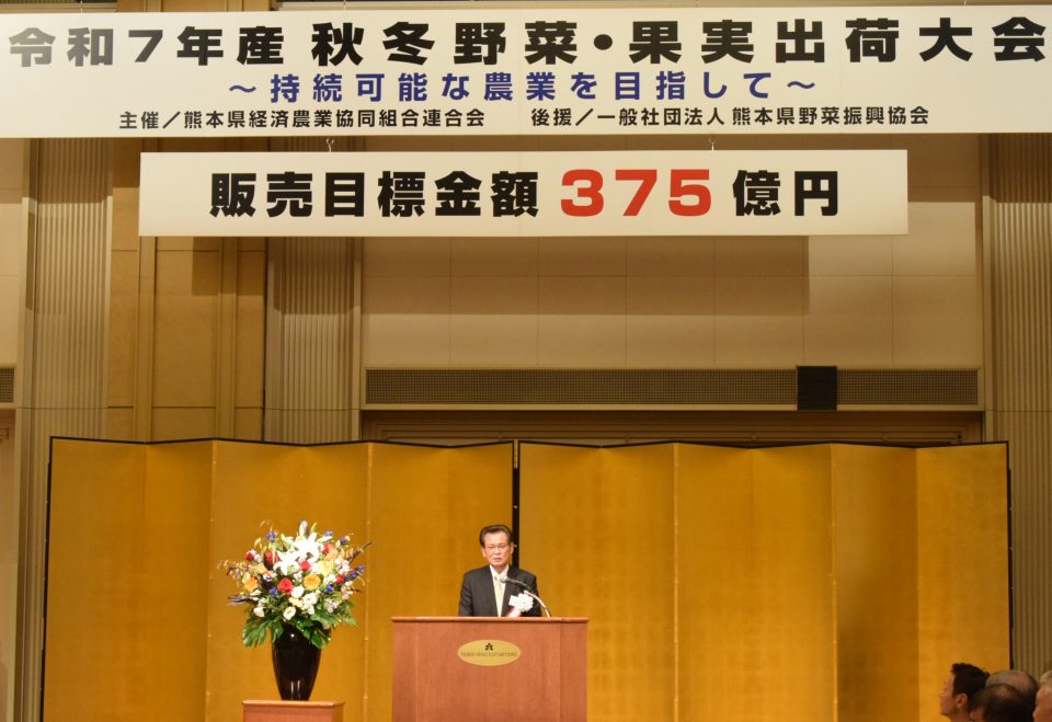 JA熊本経済連は9日、熊本市で2025年産秋冬野菜・果実出荷大会を開きました。生産者、JA、行政、全国の取引市場などからおよそ270人が出席。産地と市場が一体となり販売目標金額375億円(野菜類265億円、果実類110億円)の達成を誓いました。全国に向け、熊本県産秋冬野菜と果実の出荷が本格的に始ります。