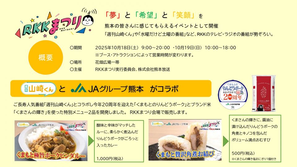 JAグループ熊本は、RKKの番組「週刊山崎くん」とコラボし、RKKまつりで販売する商品を開発しました。今年20周年を迎えた「くまもとのりんどうポーク」と、「くまさんの輝き」を使用しています。ぜひ会場でご賞味ください。