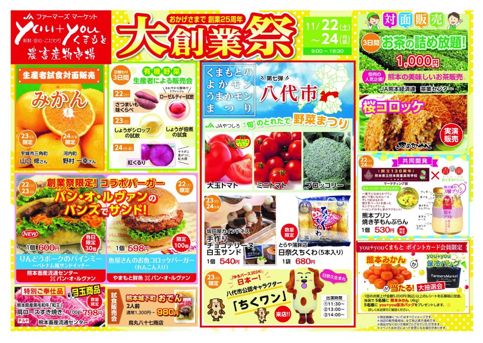 JA熊本経済連グループの直売所「you+youくまもと農畜産物市場」では、11月22日(土)~24日(月振)に創業25周年を記念した『大創業祭』を開催します。
