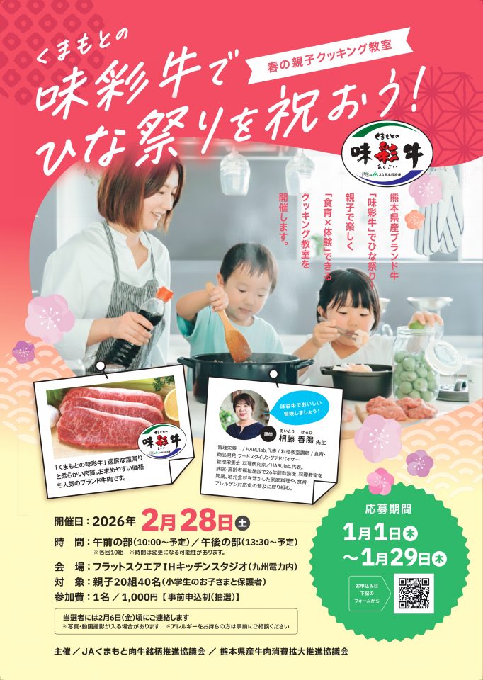 「くまもとの味彩牛でひな祭りを祝おう」春の親子クッキング教室を開催いたします。