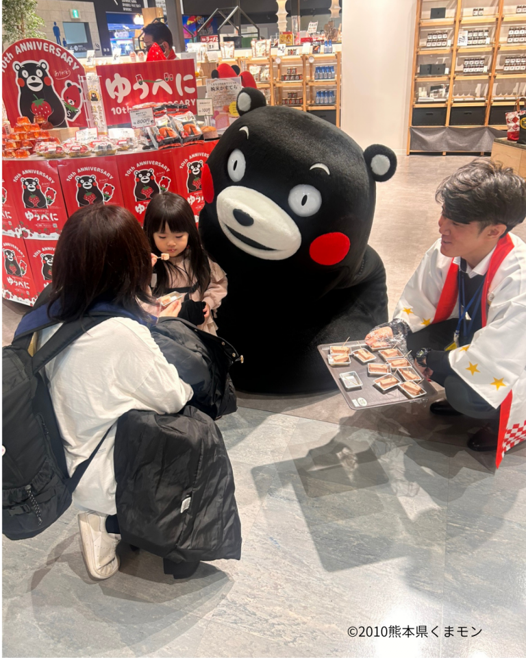 JA熊本経済連は2026年1月8日、阿蘇くまもと空港(QSHUHUB)にて、熊本県産オリジナルいちご「ゆうべに」の発売10周年を記念したイベントを開きました。主催は熊本県と同連。イベントには熊本県営業部長兼しあわせ部長のくまモンも登場し、空港利用者にゆうべにのおいしさをPRしました。会場では、搭乗前の旅行客にカットしたゆうべになどの試食や、ゆうべにを使用した加工品を販売しました。
