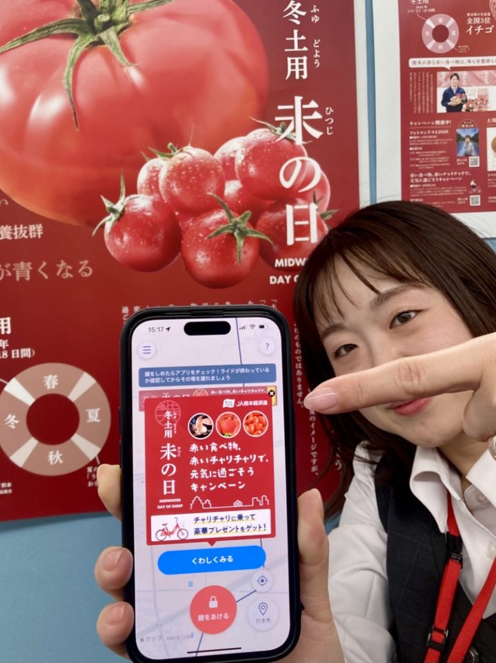 JA熊本経済連は1月5日から2月3日、シェアサイクル「チャリチャリ」とのコラボレーションによるプレゼントキャンペーンを実施しています。赤い食べ物を食べると縁起が良いとされる「冬土用未の日」に合わせた企画で、車体が赤色の「チャリチャリ」に乗って応募すると、ミニトマト「アンジェレ」や熊本県オリジナルいちご「ゆうべに」など熊本県産の赤い農畜産物が当たります。