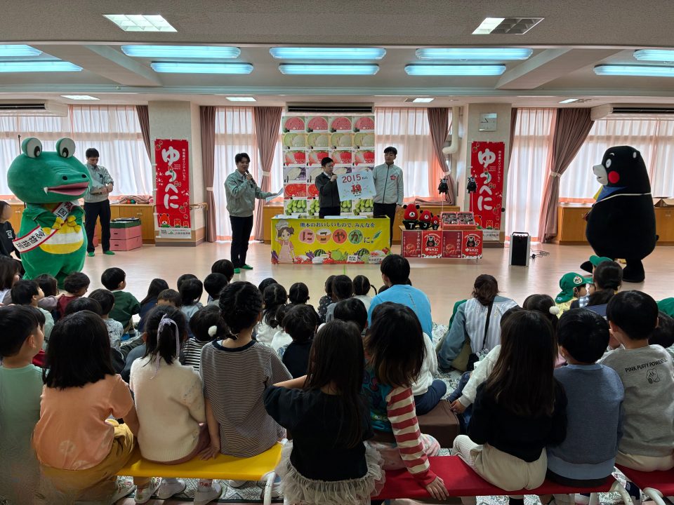 JA熊本経済連は1月27日に、大阪府豊中市の東豊中こども園にて熊本県産青果物を題材とした食育授業を行いました。0歳児から5歳児の子どもたちと先生、保護者あわせておよそ150人が参加し、「熊本の“おいしい”」を学びました。