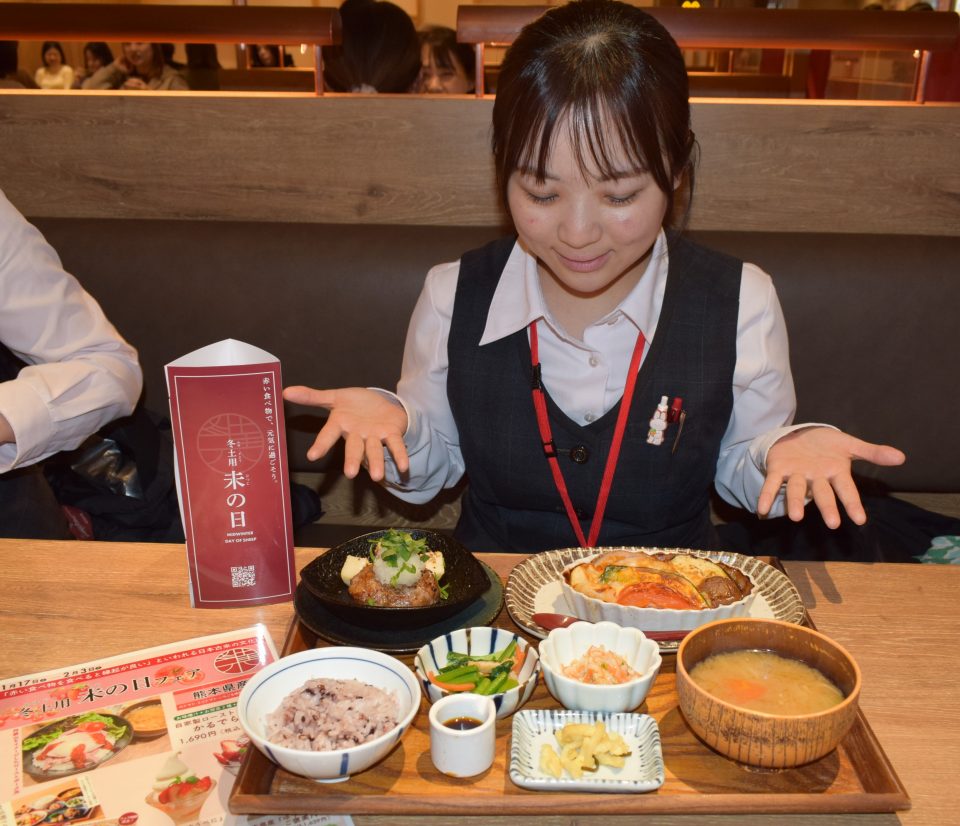JR熊本駅前の商業施設「アミュプラザくまもと」内にある、JA全農の飲食店「みのる食堂」で、1月17日から2月3日まで「冬土用未の日フェア」が開催されました。このフェアは、冬春トマト主産県(栃木県・岐阜県・愛知県・福岡県・熊本県)と全農直営飲食店舗が企画し、全国店舗でも同時開催したもの。冬土用未の日に赤い食べ物を食べると縁起が良いとされることにちなみ、熊本県産のトマトやミニトマト、いちごなどの赤い食材をふんだんに使ったメニューを提供しました。