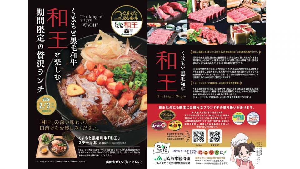JA熊本経済連とJAくまもと肉牛銘柄推進協議会は、新宿『るるぶキッチン』とコラボした「くまもと黒毛和牛『和王』ステーキ丼ランチフェア」を開催します。