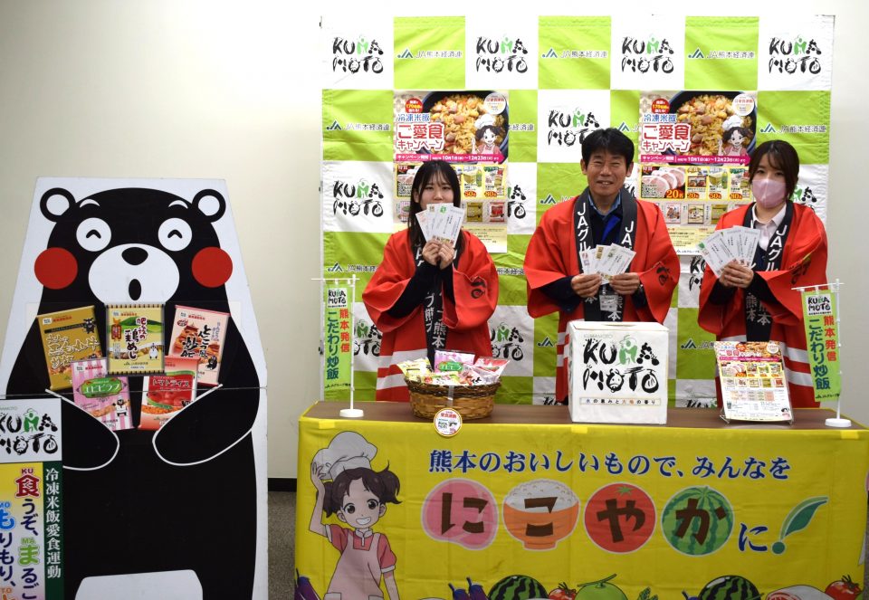 同キャンペーンは熊本県産農畜産物の消費拡大による農業の安定した経営と消費者の食に対する安全安心の要望に応えることを目的に、25年10月1日から12月23日まで実施しました。熊本県産銘柄豚「くまもとのりんどうポークロースブロック約1kg」や「純米かすてらセット」などを当選者へ贈ります。同連生活総合課の担当者は「近年、食の簡便化が進む中でも、素材にこだわった安全安心なJAグループの冷凍米飯で、これからも組合員の豊かな暮らしづくりへ貢献したい」と話します。JAグループ熊本では2009年から熊本県産農畜産物にこだわった冷凍米飯の愛食運動を展開しており、県産農畜産物の魅力発信と消費拡大に力を入れています。