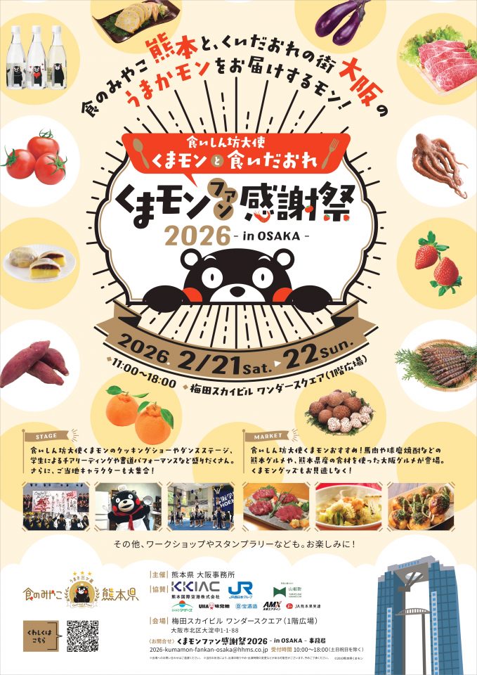 JA熊本経済連は2月21日から22日に大阪で開催される「くまモンファン感謝祭」に出店いたします。熊本県産青果物の販売や熊本県産のお花を使ったフラワーアレンジメント教室、くまもと黒毛和牛「和王」肉吸いの販売を行いますので、お近くにお住いの方、お近くで予定がある方、ぜひ、お立ち寄りください。