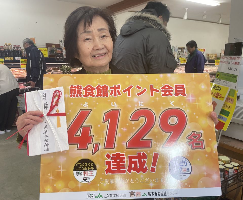 (株)熊本畜産流通センター(=JA熊本経済連グループ)が運営する工場直売精肉店「熊食館(ゆうしょくかん)」(菊池市)の新規ポイント会員数が、直近1年で1千人を超え、総会員数が4千人を突破しました。4129番目(ヨイニク)に新規会員となった熊本市北区の吉田昭子さんには、JA熊本経済連畜産部より、くまもと黒毛和牛「和王」、くまもとのりんどうポークの精肉盛り合わせ2.9㎏が贈呈されました。