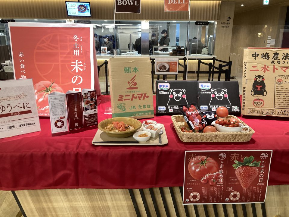 当日は、熊本県産の新鮮な野菜や果物をふんだんに使ったイベントメニューが登場し、多くの社員が味わいました。また、食堂内には販促資材を活用した冬土用未の日のPRコーナーも設置され、来場者に向けて風習や県産青果物の魅力を発信しました。