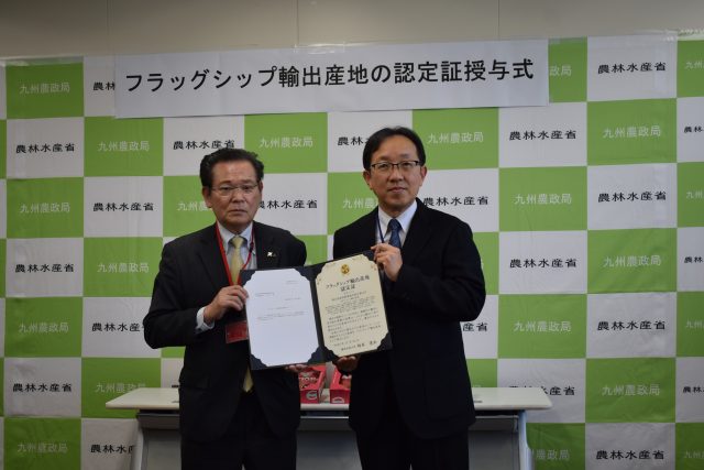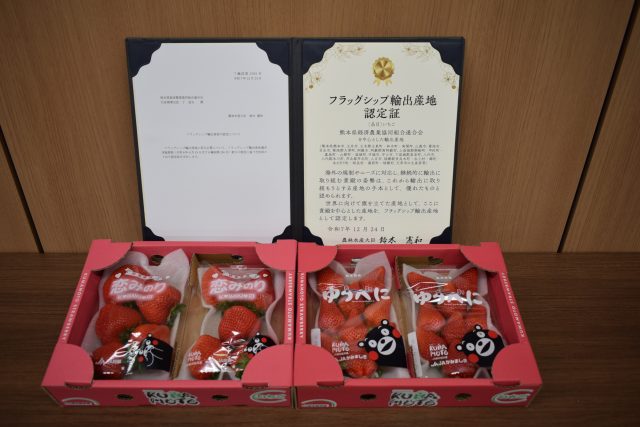 農林水産大臣が輸出の手本となる産地を認定する「フラッグシップ輸出産地」制度で、JA熊本経済連は初めて「イチゴ」で認定されました。2月26日には第3回認定証授与式が熊本地方合同庁舎で開かれ、同連の丁道夫会長が農林水産省九州農政局の緒方和之局長より認定証を受け取りました。