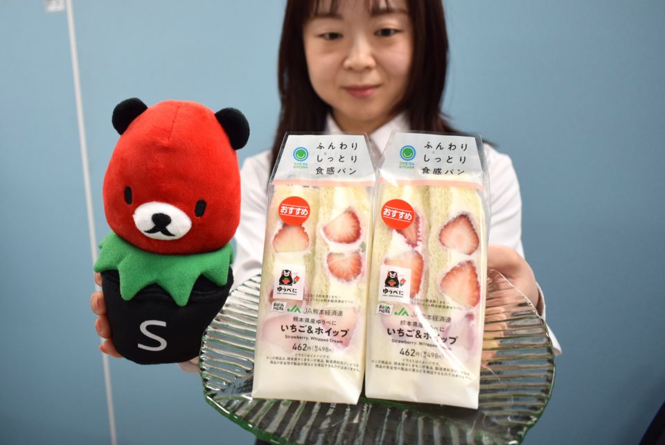 今回発売されたのは「熊本県産ゆうべにいちご&ホイップサンド」と「熊本県産ゆうべにパック」の2種類で、「ゆうべに」誕生10周年を記念したオリジナルロゴがパッケージに使用されています。購入した商品を食べて職員は「ゆうべにとクリームの甘さと酸味がちょうどよくて食べやすい」と話します。