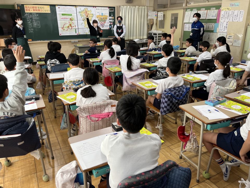 授業では全国一の生産量を誇る熊本県産のトマトやミニトマトなどを取り上げ、その栄養価や美味しい食べ方などを紹介。児童たちは、トマトやいちごの魅力や「冬土用未の日」の由来について熱心に耳を傾けました。