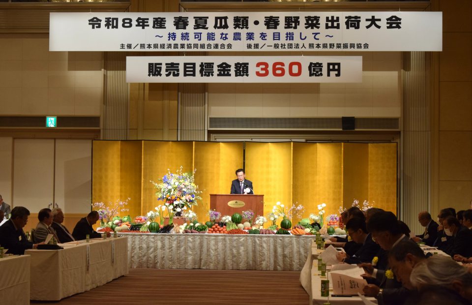 JA熊本経済連は3月12日、熊本市中央区のホテルで2026年産春夏瓜類・春野菜出荷大会を開催し、生産者や市場関係者、JA関係者ら約260人が集りました。県産春夏瓜類・春野菜の出荷が、いよいよ全国に向けて始動します。販売目標は360億円(春夏瓜類90億円、春野菜270億円)。産地と市場が一体となり、目標達成に向けて結束を固めました。