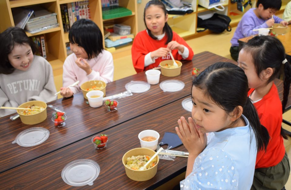 当日は同連から県産食材を提供し、ブランド豚肉の「くまもとのりんどうポーク」と米の「くまさんの輝き」をぜいたくに使った中華丼、トマトのうま味を生かしたトマトみそ汁、そして旬のいちごをそろえた豪華なランチセットが子どもたちに振舞われた。