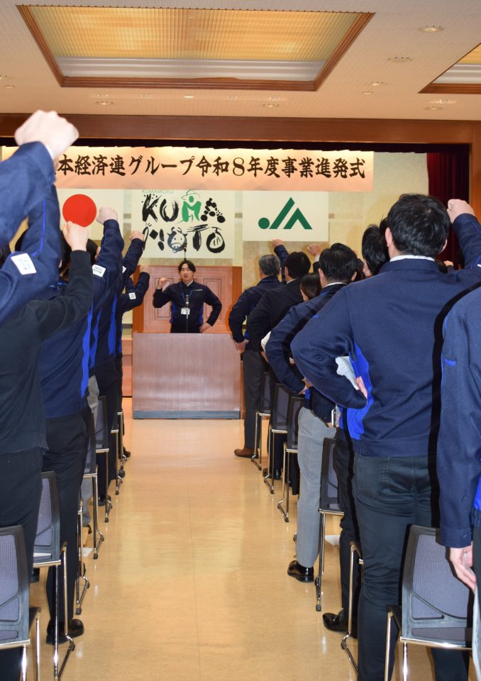 JA熊本経済連グループは4月2日、同連ホールで2026年度事業進発式を開きました。役職員と関連会社の従業員が一堂に会し、新年度の事業目標達成に向け決意を新たにしました。