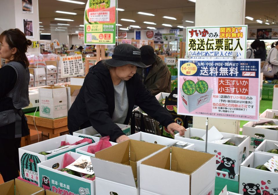 イベントの目玉となったのは、店頭に並ぶ旬のすいかを対象とした数量限定の「関西まで送料無料」キャンペーン。県外の家族や知人に熊本の味を届けられるとあって、多くの買い物客が列を作りました。すいかを購入した客の一人は「離れて暮らす子どもに熊本のすいかを送って喜んでもらいたい」と笑顔で話しました。両日とも店内は多くの買い物客で賑わい、活気に満ちあふれた2日間となりました。震災から10年の節目に、生産者と顧客が互いの絆を改めて確かめ合う、感謝と笑顔のあふれるイベントとなりました。