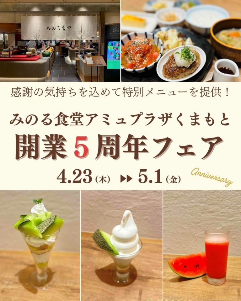 JA全農直営飲食店舗「みのる食堂アミュプラザくまもと店」では、開業5周年を記念して、旬の熊本県産食材をふんだんに使用した特別メニューを提供しています。期間は4月23日(木)~5月1日(金)です。